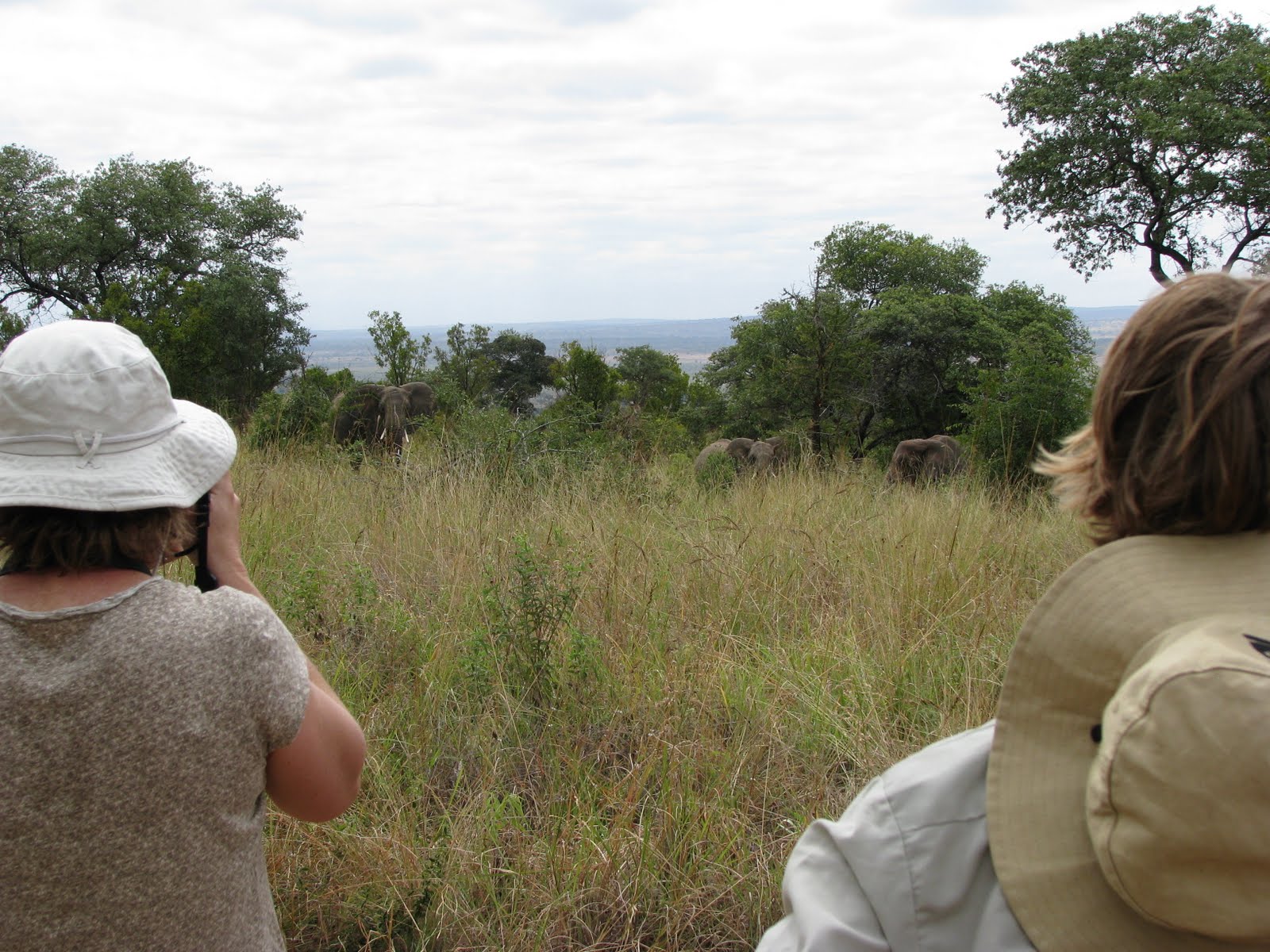 we headed out on a walking safari directly from the lodge entrance. We had two guides: a 26 year old dark-skinned, lean-limbed Maasai named Oloah (or Luis) with ritualistic circular scarring on his cheeks and Moses the "old man" who is 10 years younger than George and looks 10 years older. Not 20 minutes out from the lodge we came across a small herd of elephants. They are something to see from a land rover but something else entirely when you are on your feet at ground level and less than 40 yards away from such massive animals. After snapping a few pics, the seriousness and potential danger of the situation was